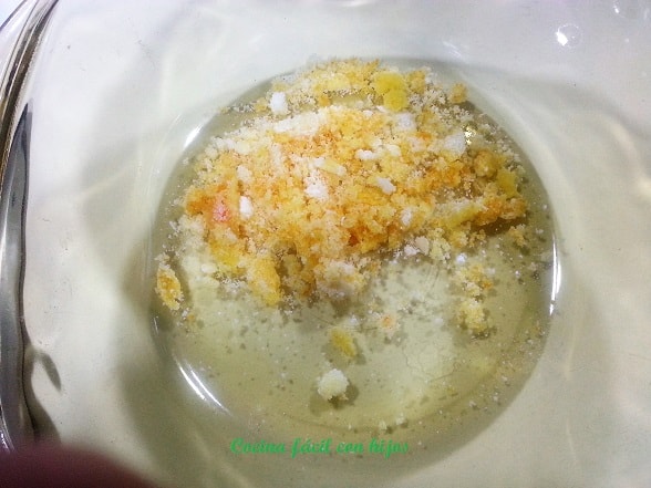 • Ponemos los 50 gr. de azúcar dentro de un cuenco, con un poco de agua, la suficiente para que esté mojada, pero sin disolverse, la tenemos que poder coger en pellizquitos.
