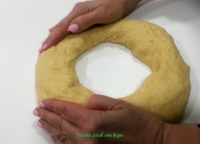 • Modelamos el roscón y metemos la sorpresa y el haba en zonas distintas, envueltas en papel de aluminio