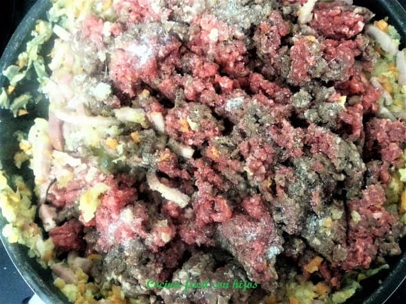 - A continuación, añadimos el bacón cortado en trocitos. Lo doramos y añadimos la ternera. Removemos con una cuchara de madera y cocinamos a fuego medio de manera uniforme evitando que se pegue a la parte inferior de la sartén.