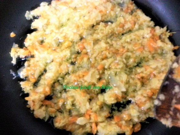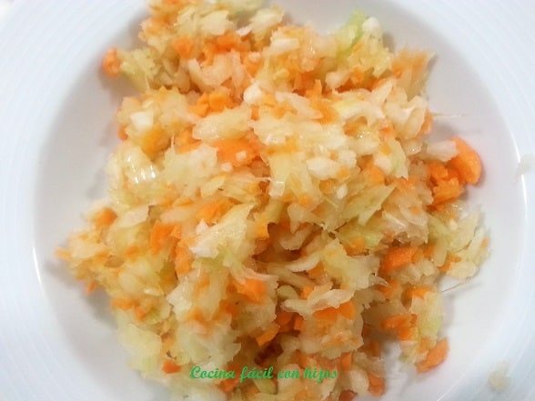 - Pelamos y picamos la cebolla y la zanahoria y lo ponemos en una sartén a fuego medio con el aceite caliente hasta que se dore la cebolla.