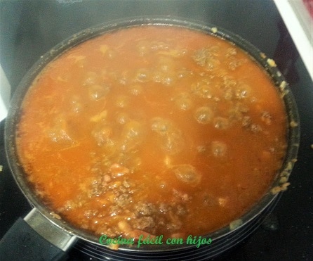 - En ese momento agregamos el tomate damos un par de vueltas, e incorporamos el agua. Mezclamos bien los ingredientes.