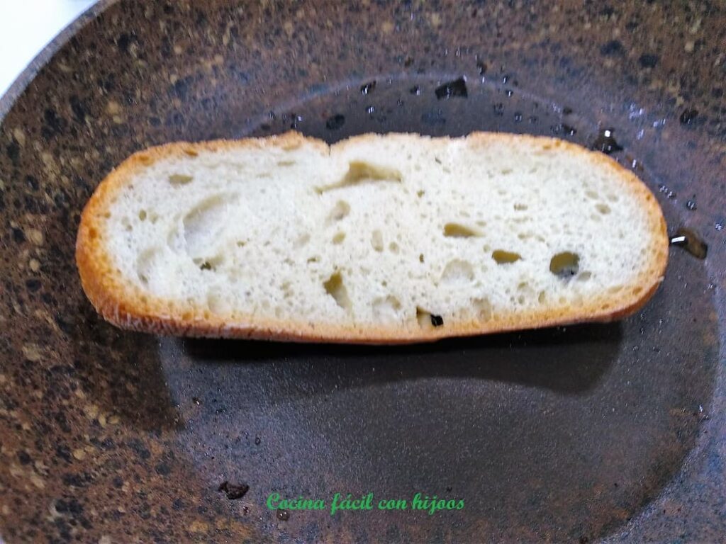 - Ponemos la rebanada de pan en una sartén con un poquito de aceite y lo tostamos hasta que esté crujiente.