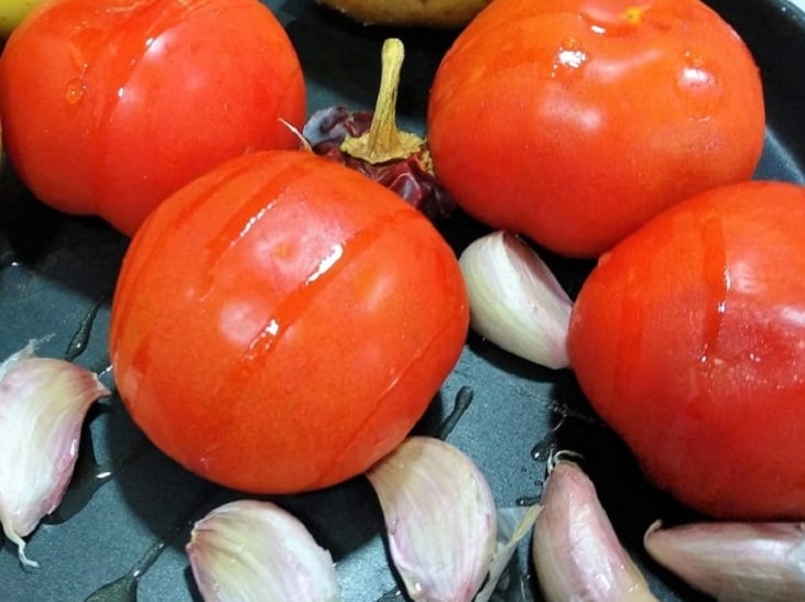 - Precalentamos el horno a 220º C., ponemos papel de hornear en una bandeja para el horno y colocamos los tomates, las ñoras y los dientes de ajos sin pelar.