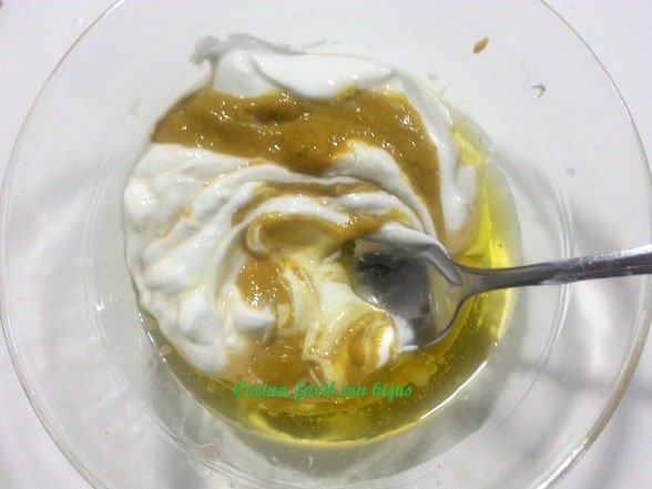 - En un bol ponemos el yogur, agregamos el acite de oliva el limón, la cucharadita de vinagre, la mostaza y mezclamos