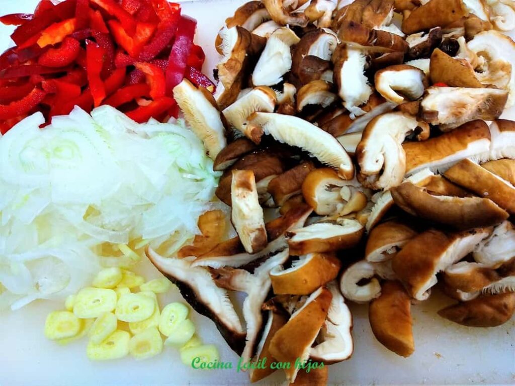 - Cortamos las verduras, picamos la cebolla en juliana, las setas, el pimiento y los ajos en láminas.