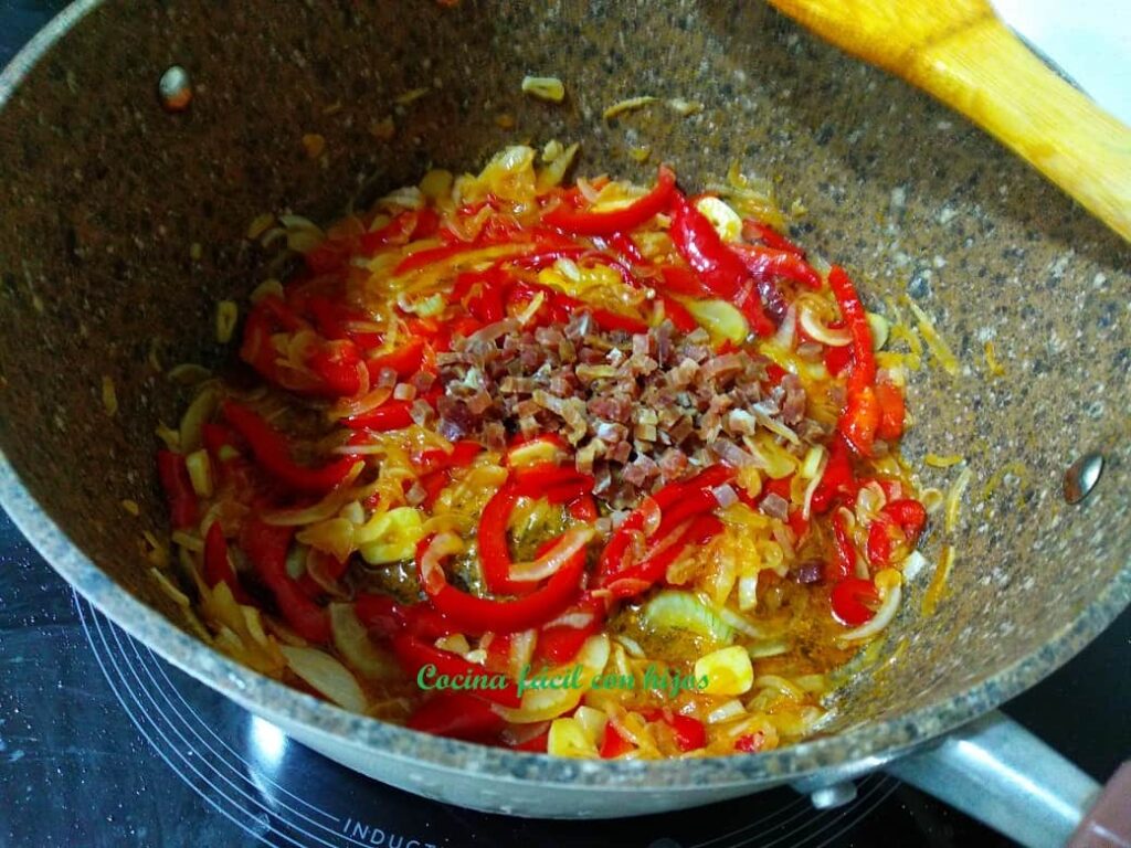 - En la misma sartén y con el mismo aceite pochamos la cebolla y el pimiento, cuando están hechos, añadimos el ajo damos un par de vueltas e incorporamos el jamón serrano.