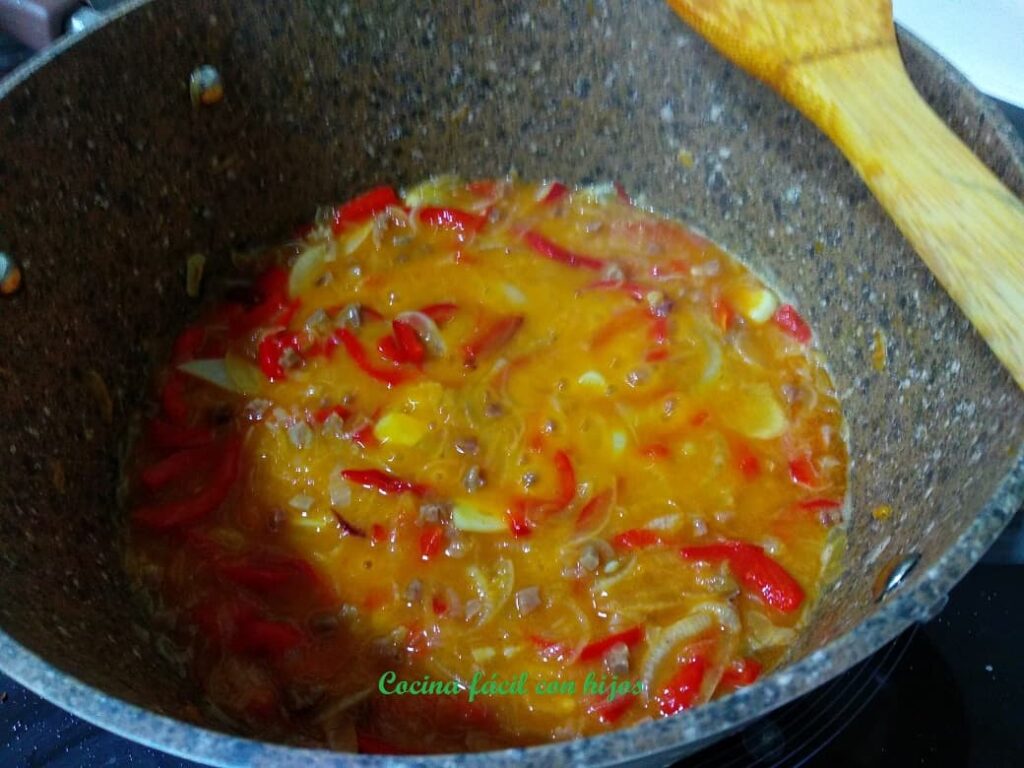 - Echamos la cucharadita de harina y de pimentón, rehogamos un poco para que pierda el sabor a crudo, y mojamos con el vino, dejamos hervir hasta que se evapore el alcohol.