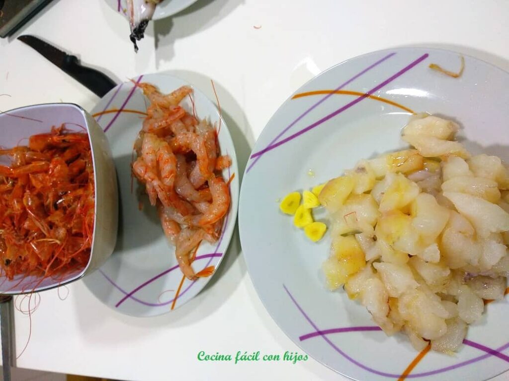 - Pelamos las gambas y troceamos los filetes de rape, lo he hecho en trocitos pequeños, para facilitar después el comerlos con la cuchara.