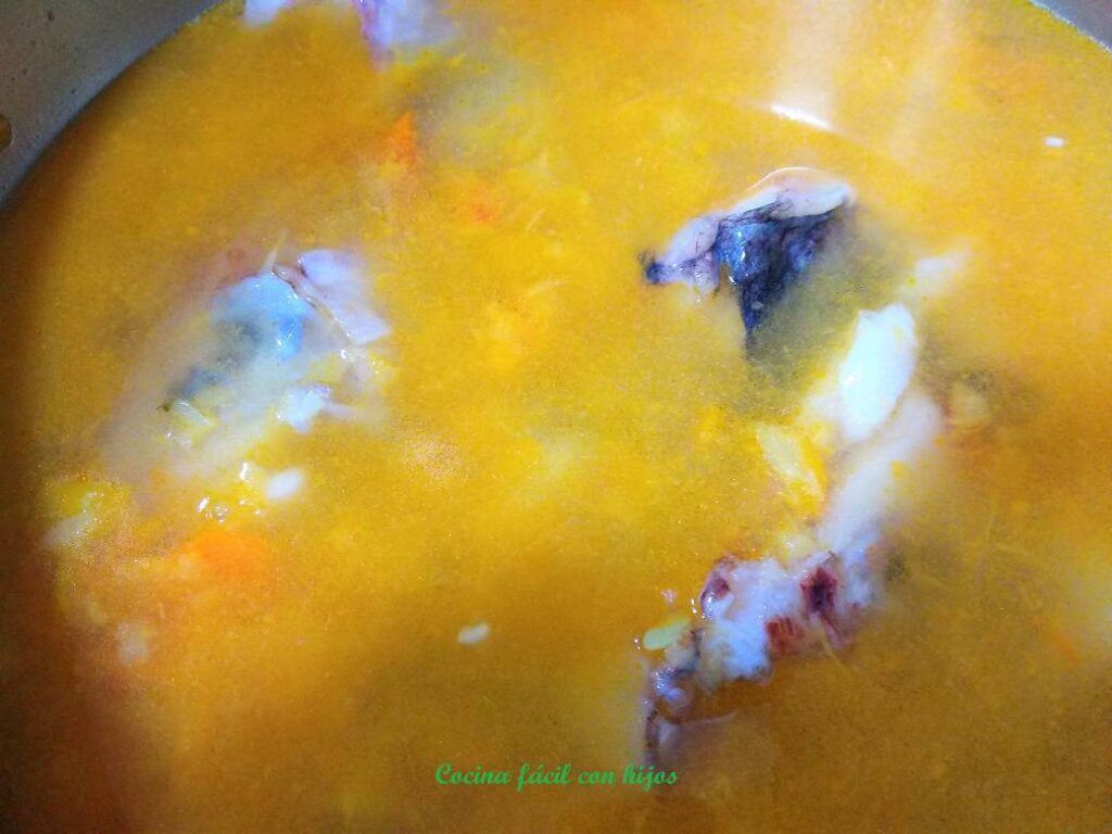 - En la cazuela añadimos un litro de agua, la primera mitad del sofrito, la cabeza y las espinas del rape, 1 zanahoria troceada y perejil.