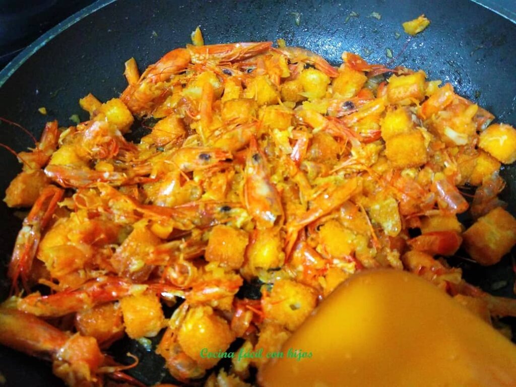 - En una sartén añadimos la otra mitad de sofrito que habíamos reservado, las cáscaras y cabezas de las gambas y unos 50 gr. del pan. Le damos un par de vueltas, echamos 1 copita de brandy y flambeamos.