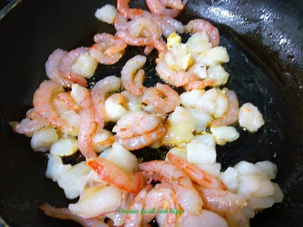 - Mientras se hace el fumet. Salteamos las gambas peladas, el rape y el ajo