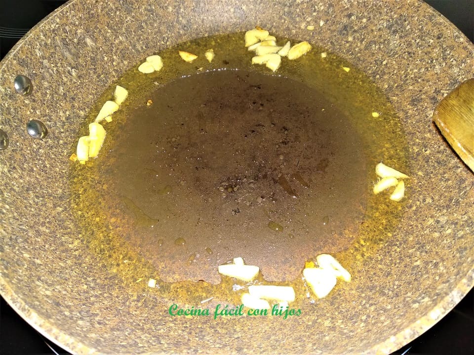 - En una sartén a fuego medio ponemos un poquito de aceite de oliva y doramos los ajos. Los retiramos antes de que se quemen.