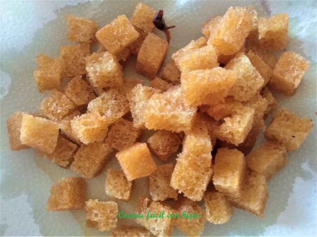 Los picatostes: En esta sopa quedan perfectos como acompañamiento. Ponlos en mesa en un cuenco, si los añades antes se esponjarán y perderán el toque crujiente.