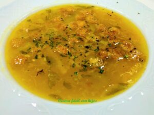 Si se hace con agua o con caldo de verduras la pueden tomar las personas vegetarianas y las veganas. Si estas a dieta no añadas los picatostes.
