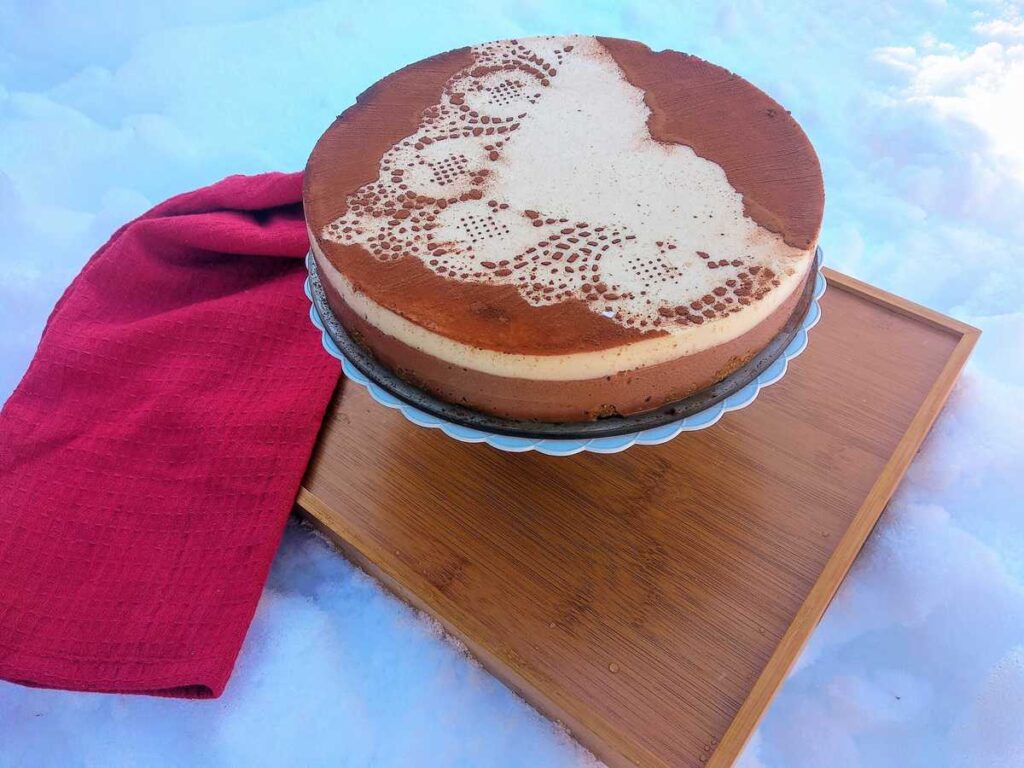 Consiste en una galleta suave, con tres capas de mousse de tres chocolates y cubierta con un velo de cacao en polvo y te voy a contar un secreto ¡es mucho más fácil de hacer de lo que parece!