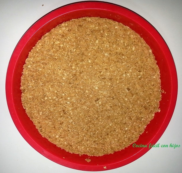 - Con ayuda de las manos y de una cuchara forramos un molde, con la mezcla de galletas y mantequilla y lo metemos en el microondas 3 minutos máxima potencia.