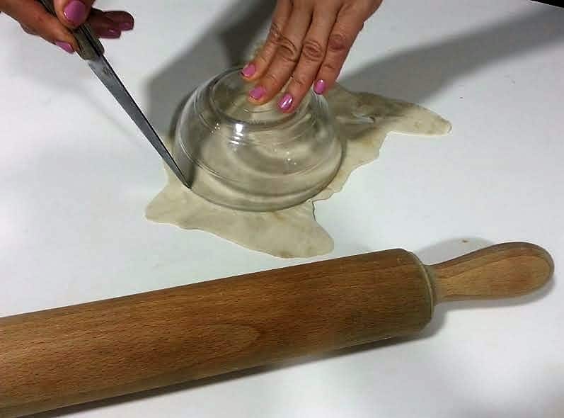 - Cuando ya está extendida, ponemos encima de la masa una taza del diámetro que deseamos darle y con la punta de un cuchillo vamos cortando la masa.