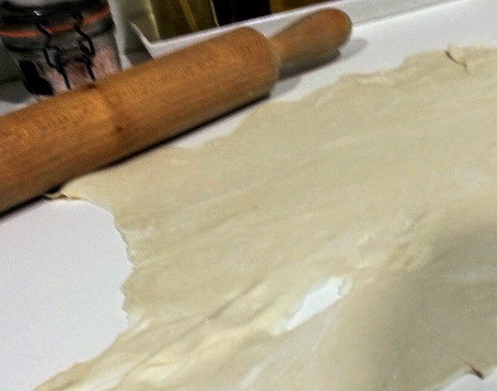 - Colocamos la masa de hojaldre en una superficie que previamente habremos espolvoreado con harina, con ayuda de un rodillo vamos extendiéndola hasta dejarla lo más fina posible.