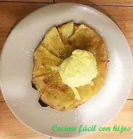 Afortunadamente, yo sí, voy a poder dejar a mis hijos estos recuerdos. De hecho, ellos me ayudan durante todo el proceso de preparación de la tarta; pinchan la base, colocan las rodajas de manzana que yo voy cortando, las pincelan con mantequilla y colocan las bolas de helado en cada porción.