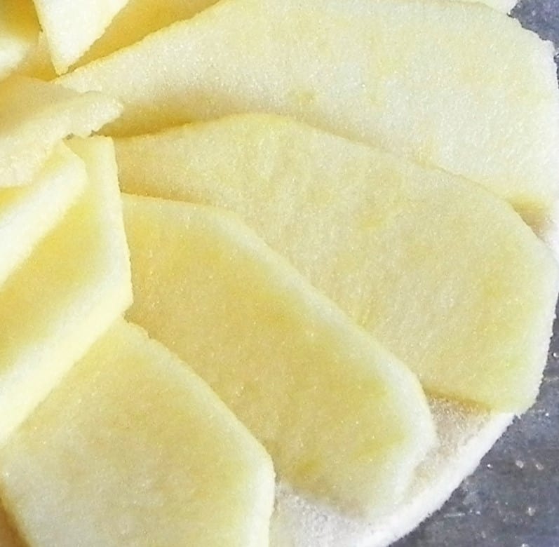 - Preparamos las manzanas: las pelamos, las descorazonamos y se laminan, con ayuda de una mandolina es mucho más fácil. formando un círculo sobre la base.
