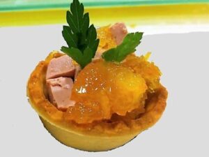 Vamos hacer un relleno de paté que sirve de base para la tartaleta, el ingrediente principal es el paté. Y lleva una guarnición de cebolleta y un acompañamiento de mermelada. Lo puedes adornar de diferentes modos según tu gusto, desde cebollino picado, caviar, aceite de trufa, perejil…