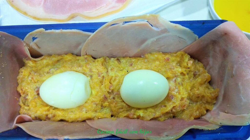 - Vertemos un poco del relleno sobre el jamón York, lo suficiente para hacer una cama a los huevos duros pelados.