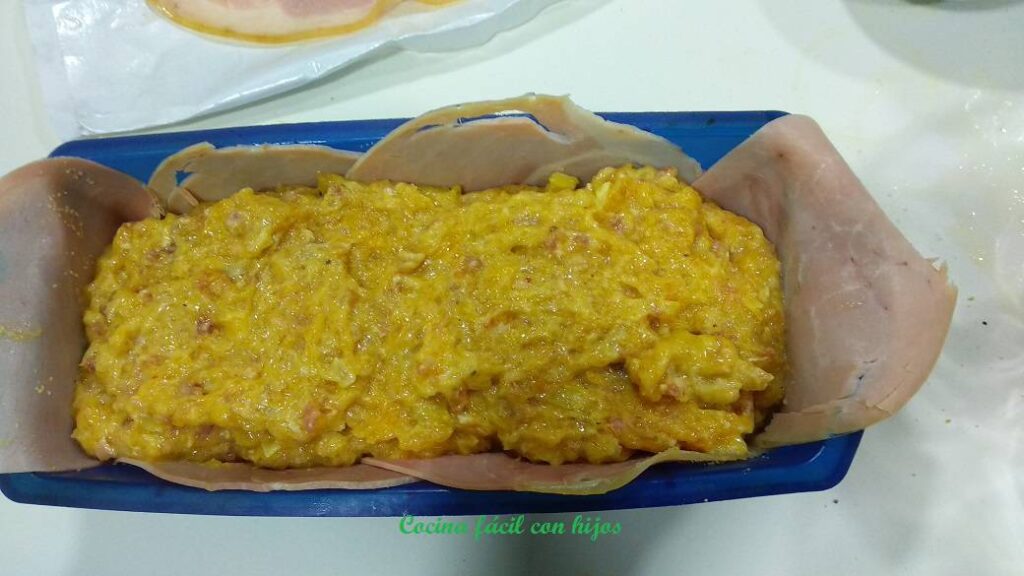 - Forramos la terrina con el jamón york, cuidando que sobresalga por los bordes de la terrina.
