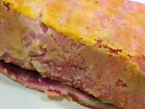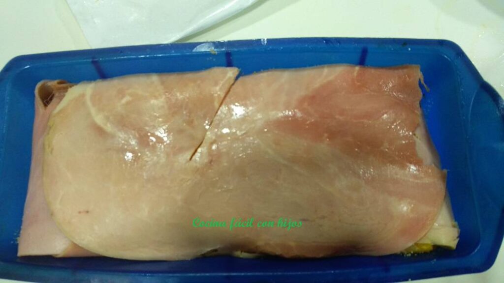 - Ponemos una loncha de jamón de york como tapa de la terrina y volvemos hacía dentro los bordes de jamón de york que sobresalen de la terrina.