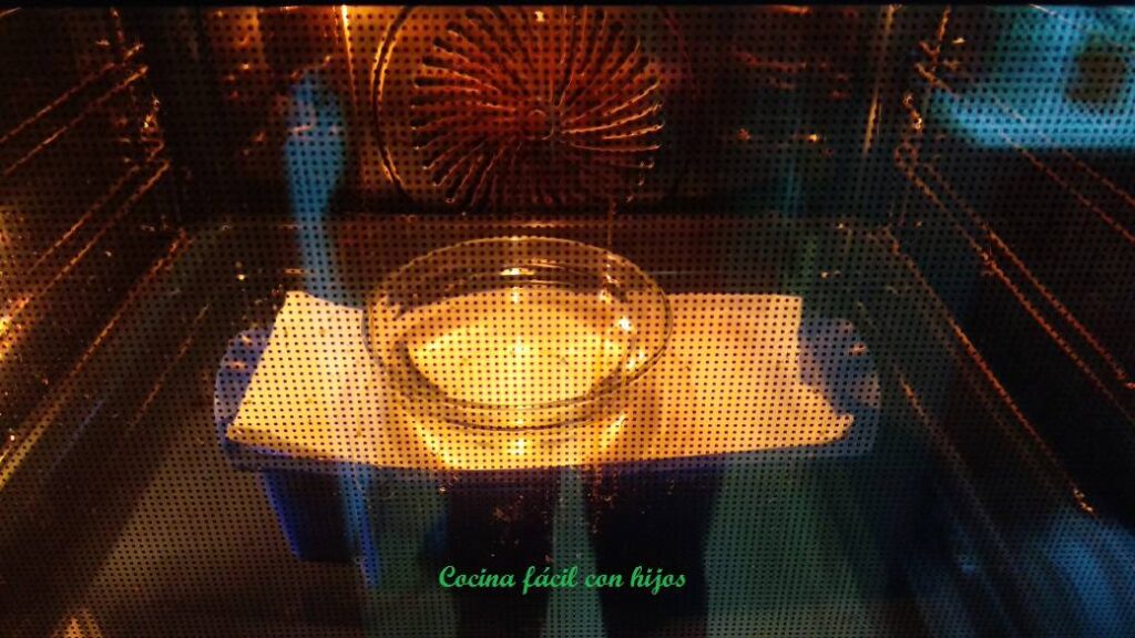- Ponemos en el horno un cuenco, apto para hornos, lleno de agua y colocado encima de la terrina, para; que esté húmedo el aire en el horno. Además de esta forma evitamos que se levante el papel del horno.