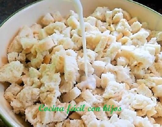 - Troceamos el pan y añadimos la leche, para que vaya absorbiendo la leche poco a poco.