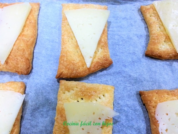 - Sobre la lámina de hojaldre caliente ponemos el queso.
