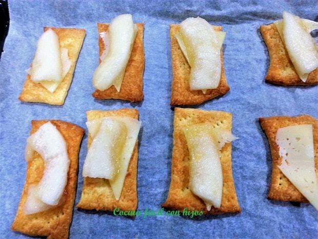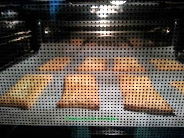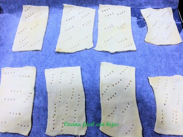 - Cortamos la lámina de hojaldre en rectángulos, las ponemos en la bandeja sobre papel de horno. Las pinchamos con un tenedor para evitar que suba cuando la metamos en el horno.