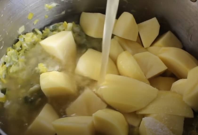 - Agrega las patatas y el caldo. Sazonar con sal y pimienta.