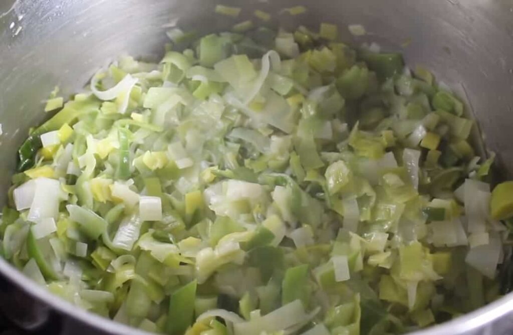 - Calienta la mantequilla y el aceite en una sartén. Agrega los puerros y la cebolla y cocine a fuego medio durante unos 10 minutos hasta que estén tiernos.